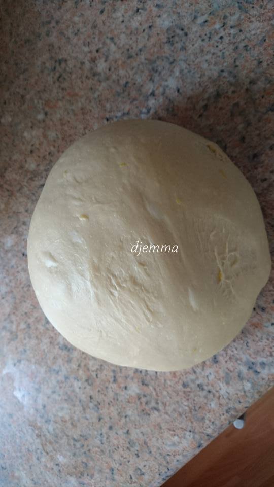 През това време приготвяме мазнината, аз ползвах 100 олио + 100 масло. Включваме на първа скорост и по малко наливаме, докато свърши цялата мазнина. Тестото изглежда рядко, маже под куката, но това да не ви притеснява. Накрая го вадим от купата върху намазнен плот и с ръка го поомесваме. Готовото тесто има следната структура:
